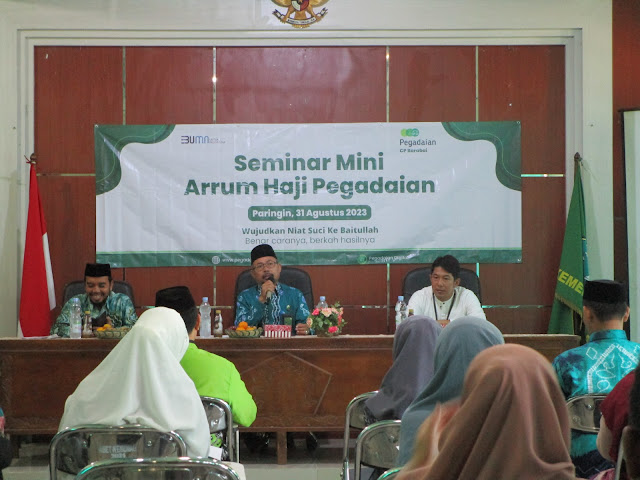 Paringin (Kemenag Balangan) - "Masalah haji itu unik. Perkara berangkat atau tidak, itu bukan urusan kita," begitu disampaikan Kepala Kantor Kementerian Agama Kabupaten Balangan, Drs. H. Saribuddin, M.Pd.I dalam acara Seminar Mini Arrum Haji Pegadaian di Aula Asy Syura Kantor Kemenag Balangan, Kamis (31/08/23).